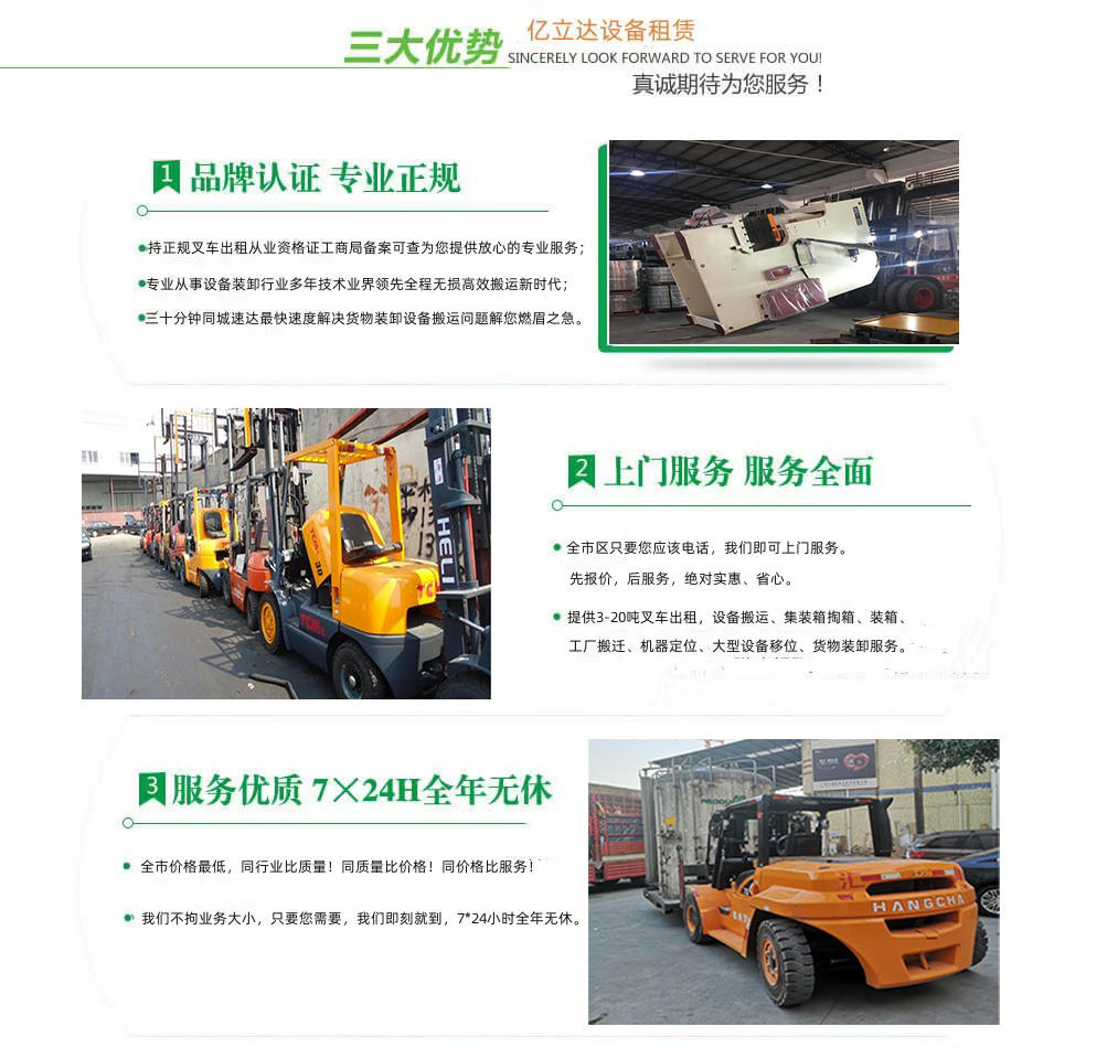 亿立达设备租赁有限公司是工商局准许的天津商务职业学院专业叉车出租公司,公司本着诚信、服务、效率、创新的经营理念,用精湛的技术,真诚的服务,为众多客户提供优质的服务,同时获得信赖与支持。专业提供天津商务职业学院3-20吨叉车出租、叉车租赁、设备搬运、集装箱掏箱装箱、机器移位定位、货物装卸、工厂搬迁、安全可靠,收费透明,价格便宜,随叫随到,24小时上门服务!本公司叉车吊车师傅对各种设备搬运装卸都有深刻探讨和研究。很多的疑难设备搬运,通过我公司的叉车师傅都能迎刃而解。对各种进口设备、国产机器、大型设备搬迁、高难度搬迁、各种精密仪器、医疗设备、科研设备等都能搬运; 提供全市 24 小时上门装卸搬运服务。同时提供厂房搬迁服务。 ...